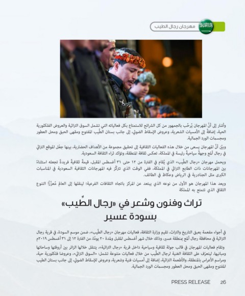 في أجواء مفعمة بعبق التاريخ والتراث ،تقيم وزارة الثقافة ،فعاليات مهرجان «رجال الطِّيب» ،ضمن موسم السودة ،في قرية رجال
