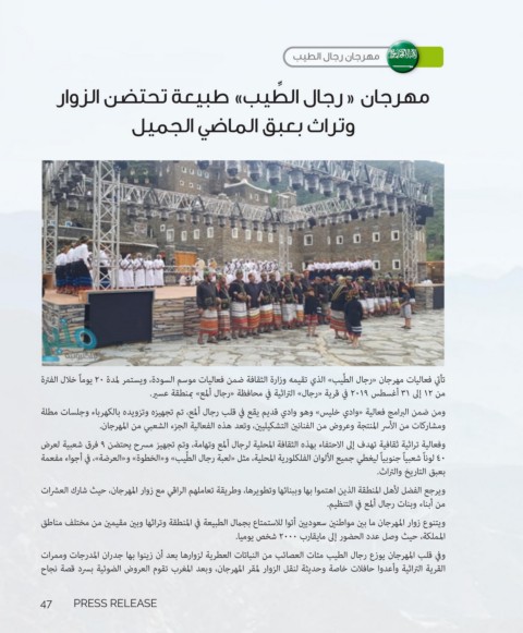 ‫تأتي فعاليات مهرجان «رجال الطِّيب» الذي تقيمه وزارة الثقافة ضمن فعاليات موسم السودة‪ ،‬ويستمر لمدة ‪ 20‬يوماً خلال الفترة‬