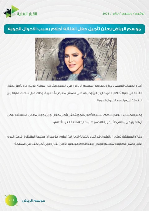 موسم الرياض يعلن تأجيل حفل الفنانة أحلام بسبب الأحوال الجوية
