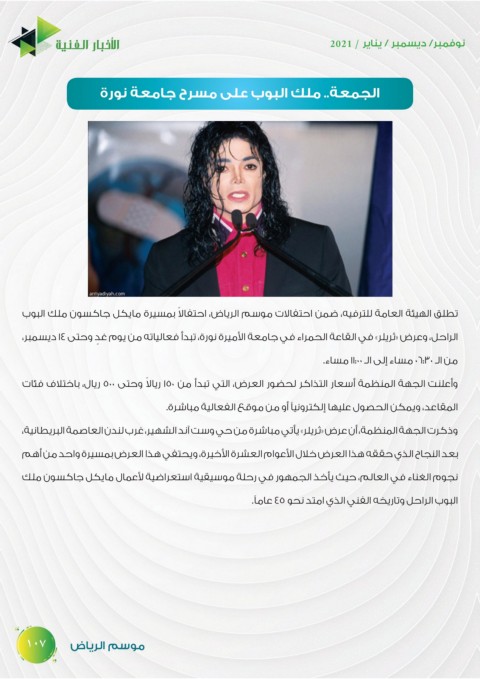 ‫تطلق الهيئة العامة للترفيه‪ ،‬ضمن احتفالات موسم الرياض‪ ،‬احتفال ًا بمسيرة مايكل جاكسون ملك البوب‬