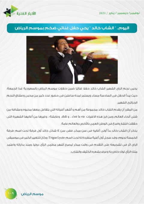 ‫يحيى نجم الراى الشهير الشاب خالد حفلا غنائيا ضمن حفلات موسم الرياض بالسعودية غدا الجمعة‪،‬‬