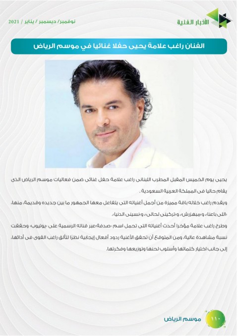 يحيى يوم الخميس المقبل المطرب اللبنانى راغب علامة حفل غنائى ضمن فعاليات موسم الرياض الذى