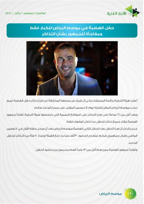 أعلنت هيئة الترفية برئاسة المستشار تركي آل شيخ ،عبر منصتها المختلفة عن طرح تذاكر حفل الهضبة عمرو