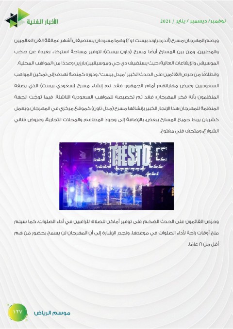 الموسيقى والإيقاعات العالية؛ حيث يستضيف دي جي وموسيقيين بارزين وعد ًدا من المواهب المحلية.