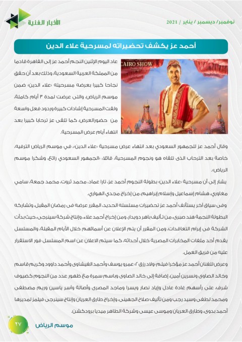 يشار إلى أن مسرحية «علاء الدين» بطولة النجوم أحمد عز ،تارا عماد ،محمد ثروت ،محمد جمعة ،سامي