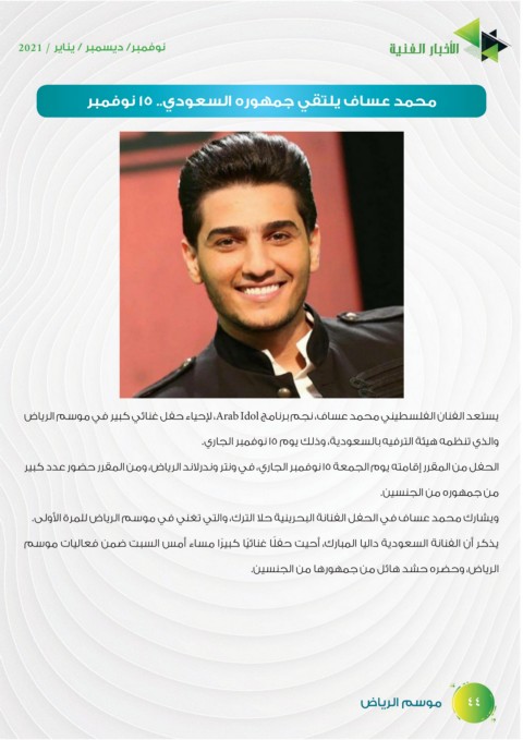 يستعد الفنان الفلسطيني محمد عساف ،نجم برنامج ،Arab Idolلإحياء حفل غنائي كبير في موسم الرياض
