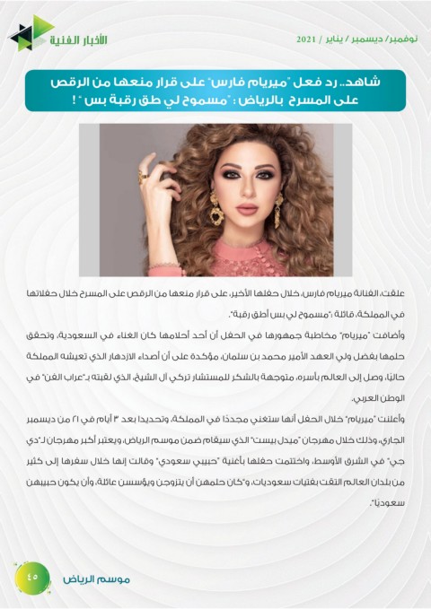 ‫وأعلنت “ميريام” خلال الحفل أنها ستغني مجد ًدا في المملكة‪ ،‬وتحديدا بعد ‪ 3‬أيام في ‪ ٢١‬من ديسمبر‬