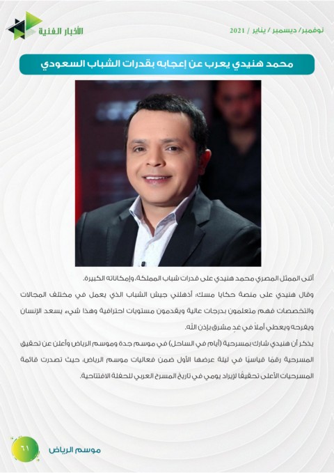 أثنى الممثل المصري محمد هنيدي على قدرات شباب المملكة ،وإمكاناته الكبيرة.