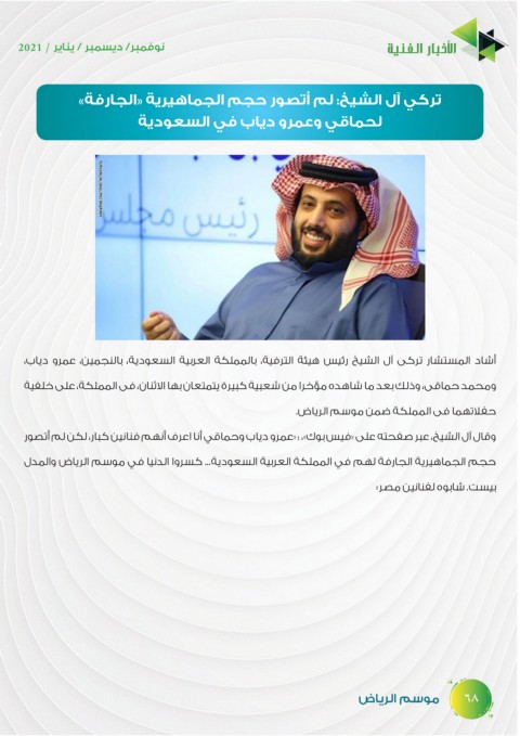 أشاد المستشار تركى آل الشيخ رئيس هيئة الترفية ،بالمملكة العربية السعودية ،بالنجمين ،عمرو دياب،