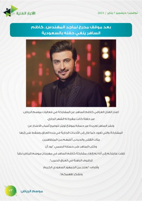 اعتذر الفنان العراقي كاظم الساهر ،عن المشاركة في فعاليات موسم الرياض،