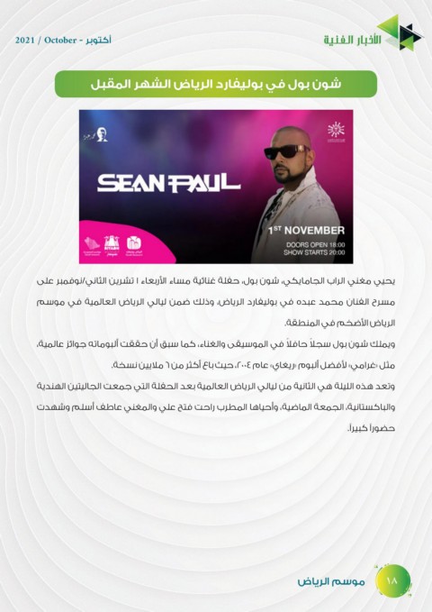 يحيي مغني الراب الجامايكي ،شون بول ،حفلة غنائية مساء الأربعاء 1تشرين الثاني/نوفمبر على