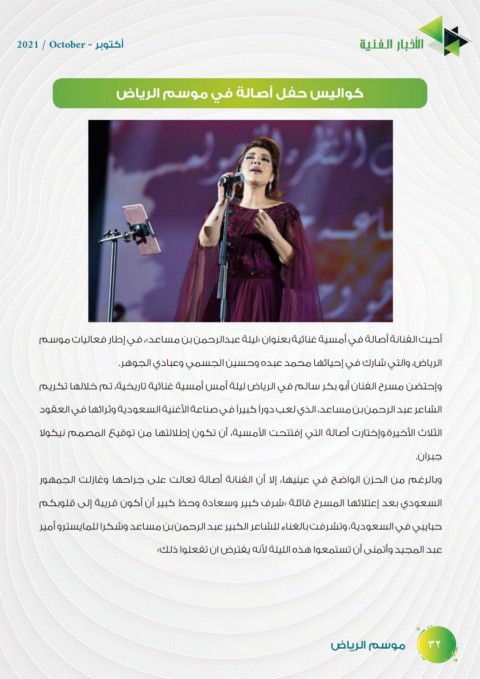 أحيت الفنانة أصالة في أمسية غنائية بعنوان «ليلة عبدالرحمن بن مساعد» ،في إطار فعاليات موسم