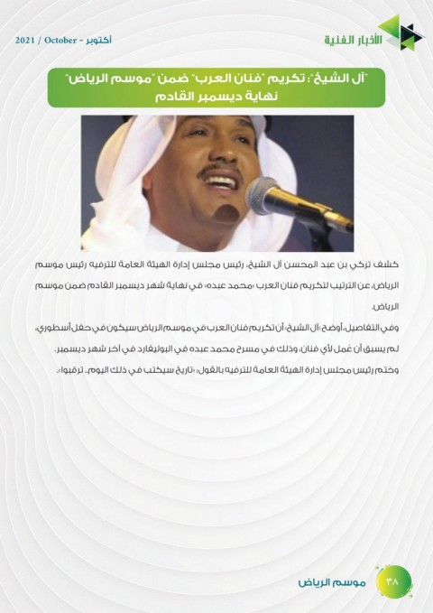 الرياض ،عن الترتيب لتكريم فنان العرب «محمد عبده» في نهاية شهر ديسمبر القادم ضمن موسم