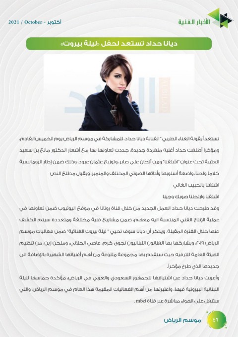 عنها خلال الفترة المقبلة .ويذكر أن ديانا سوف تحيي ” ليلة بيروت الغنائية” ضمن فعاليات موسم