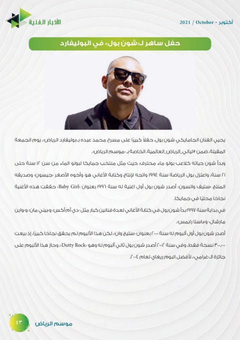 يحيي الفنان الجامايكي شون بول ،حفل ًا كبي ًرا على مسرح محمد عبده بـ«بوليفارد الرياض» ،يوم الجمعة