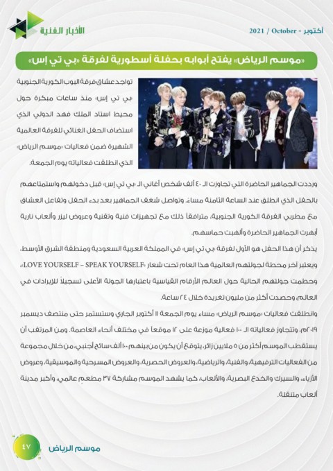 يذكر أن هذا الحفل هو الأول لفرقة «بي تي إس» في المملكة العربية السعودية ومنطقة الشرق الأوسط،