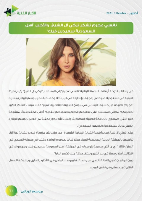 في رسالة مفتوحة أرسلتها النجمة اللبنانية “نانسي عجرم” إلى المستشار “تركي آل الشيخ” رئيس هيئة