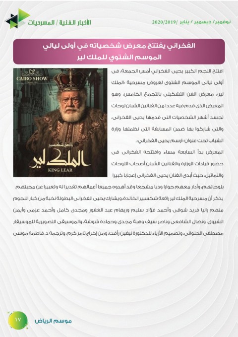 يذكر أن مسرحية الملك لير رائعة شكسبير الخالدة ،ويشارك يحيى الفخرانى البطولة نخبة من كبار النجوم